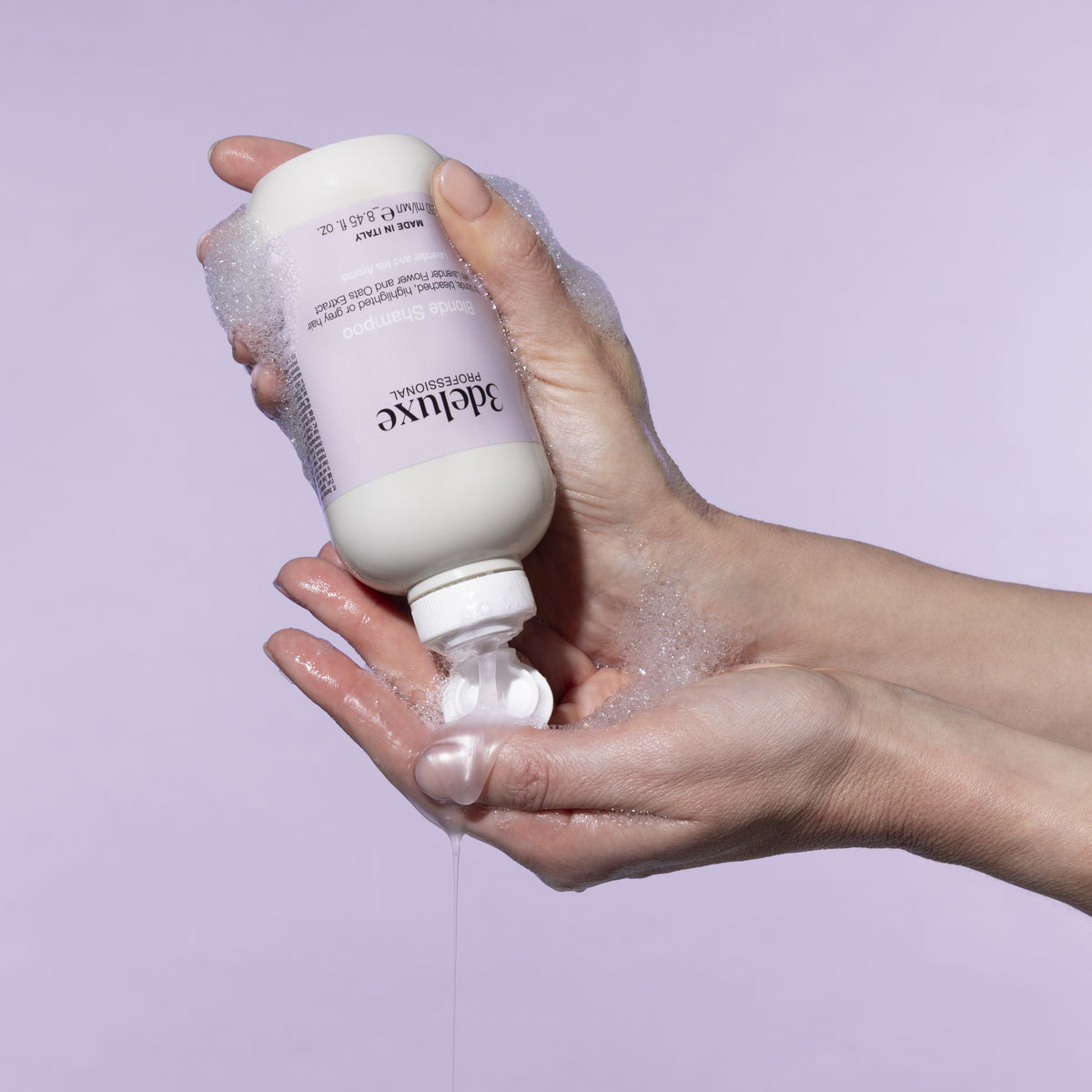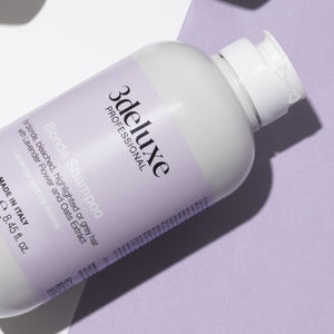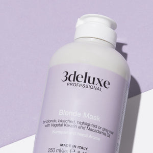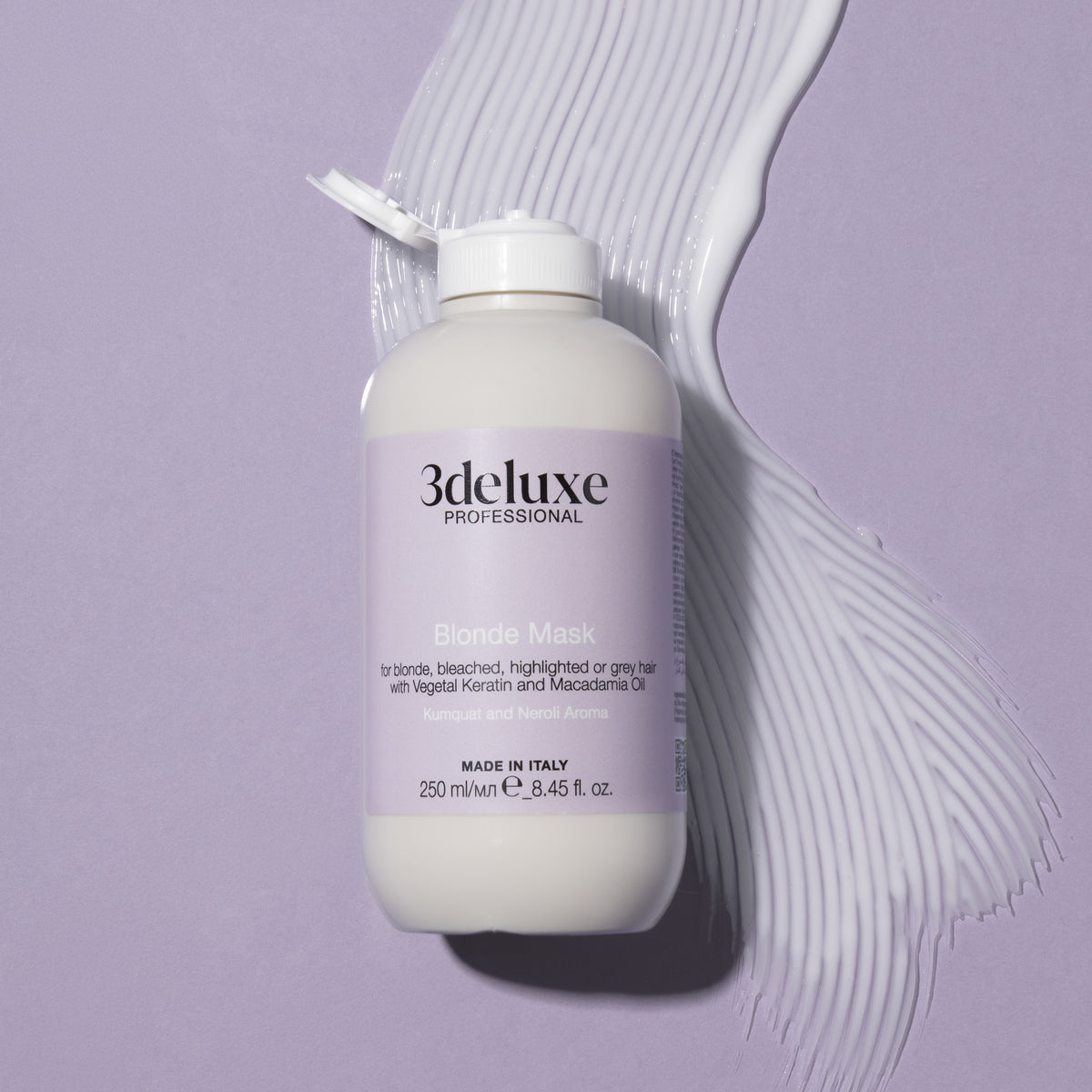 The 3deluxe Blonde Collection gently cleanses, nourishes, and illuminates blonde, bleached, highlighted, and grey hair. Infused with lavender, oats, vegetal keratin, and macadamia oil, it enhances tone clarity while restoring softness, hydration, and natural shine.